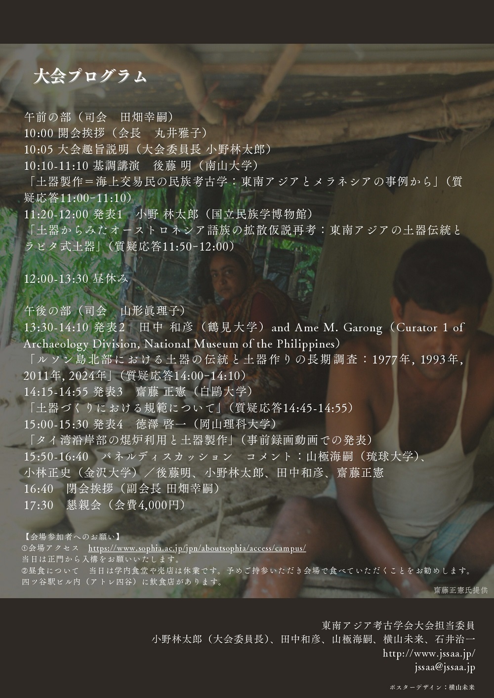 13:30-14:10 発表2 田中 和彦(鶴見大学)and Ame M. Garong(Curator 1 of Archaeology Division, National Museum of the Philippines)「ルソン島北部における土器の伝統と土器作りの長期調査:1977年, 1993年, 2011年, 2024年」(質疑応答14:00-14:10)