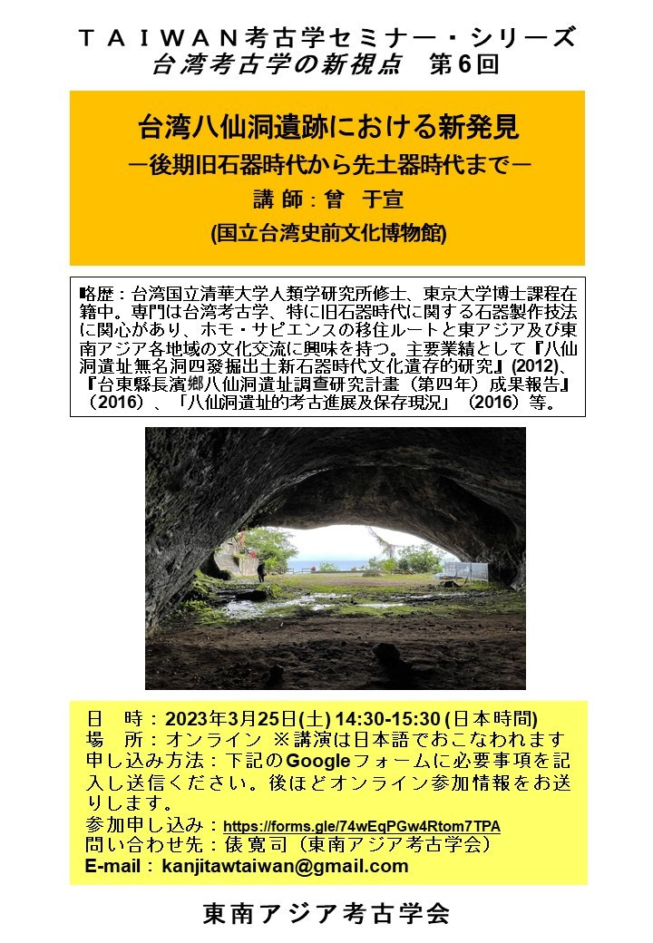 東南アジア考古学会では、2022年度オンライン企画「TAIWAN考古学セミナー・シリーズ《台湾考古学の新視点》」第6回目としまして、曾于宣先生(国立台湾史前文化博物館)をお招きし、来る2023年3月25日(土)14時30分~15時30分「台湾八仙洞遺跡における新発見-後期旧石器時代から先土器時代まで-」を開催いたします。